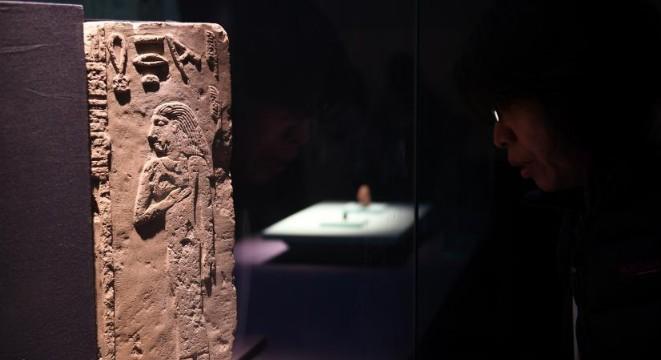 1月22日,《法老的国度——古埃及文明展》在浙江省博物馆开展,来自意大利多家博物馆的180件古埃及文物集中亮相。图为观众参观假门柱残件。中新社记者 王刚 摄