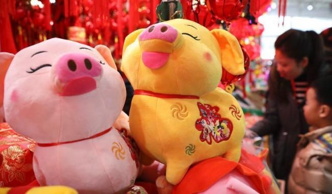 1月23日,正在北京全国农业展览馆举办的2019老北京年货大集人头攒动、热闹非凡。全国各地区优质特色产品及民俗文化在此一一呈现,给北京市民带来精彩纷呈的购物体验。年货大集上的一对“猪公仔”。中新社记者 赵隽 摄