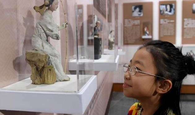 1月24日,一名小学生欣赏第二代“泥人张”张玉亭的彩塑作品《渔女》。