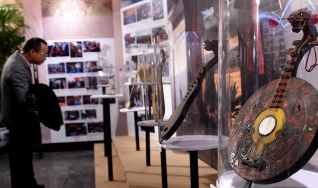 1月24日,观众在观看展出的白族木制乐器。 新华社记者 罗晓光 摄