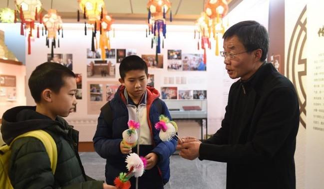 1月24日,汴京灯笼张第七代传人张俊涛(右一)向小朋友介绍传统纸艺玩具“变花”。 新华社记者 罗晓光 摄