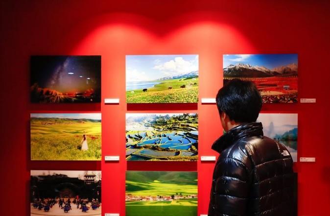 2月18日,在韩国首尔,一名参观者欣赏参展作品。 由中国驻韩国大使馆、首尔市政府共同主办的中韩旅游图片展18日在首尔拉开帷幕。参展作品通过丰富色彩和多元视角,为参观者展现了中韩两国各具特色的风光。