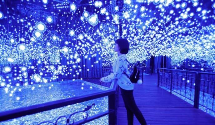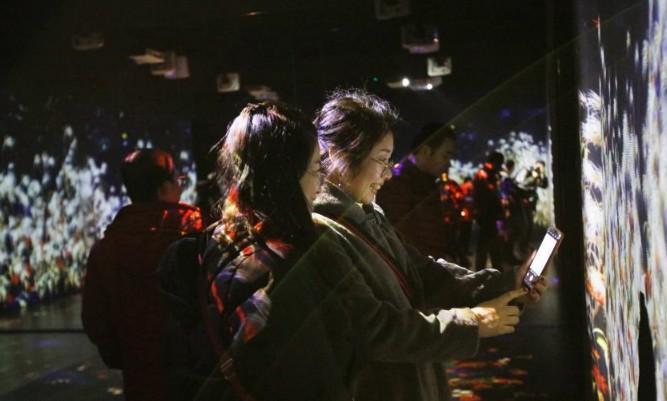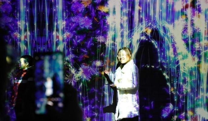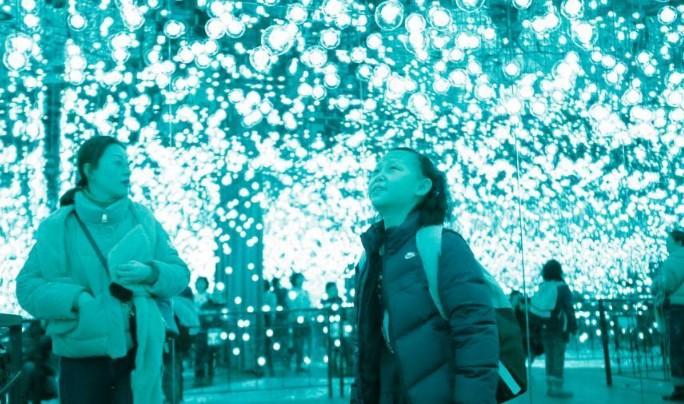 2月21日,随着气温逐渐上升,冰雪消融,哈尔滨冰雪旅游景区纷纷闭园,“花涧追光”光影艺术展为哈尔滨百年中央大街增添创新的旅行体验。该展将科技与艺术相结合,在虚拟互动游戏中呈现逼真的3D效果,打造全方位沉浸式艺术体验。图为游客参观“星河池畔”展区。
