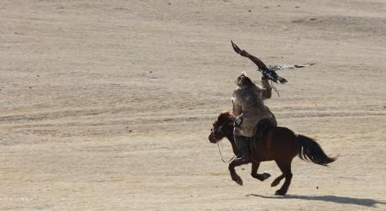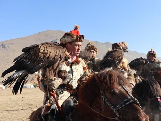 3月3日,在蒙古国乌兰巴托南郊,驯鹰人表演狩猎时与猎鹰的协调与配合。 为期两天的蒙古国春季猎鹰节当天在首都乌兰巴托南郊成吉思汗大营旅游基地开幕。来自西部巴彦乌列盖省的哈萨克族驯鹰手们为观众表演了如何与猎鹰协调配合捕捉猎物的绝技。来自十多个国家和地区的游客来到乌兰巴托观看此次猎鹰节。 新华社记者 阿斯钢 摄