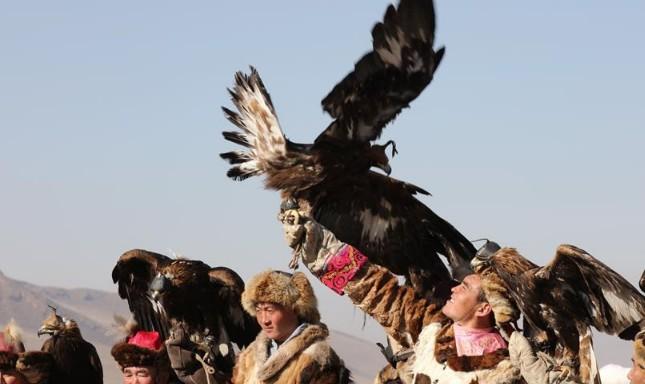 3月3日,在蒙古国乌兰巴托南郊,驯鹰人向观众展示自己的猎鹰。 为期两天的蒙古国春季猎鹰节当天在首都乌兰巴托南郊成吉思汗大营旅游基地开幕。来自西部巴彦乌列盖省的哈萨克族驯鹰手们为观众表演了如何与猎鹰协调配合捕捉猎物的绝技。来自十多个国家和地区的游客来到乌兰巴托观看此次猎鹰节。 新华社记者 阿斯钢 摄