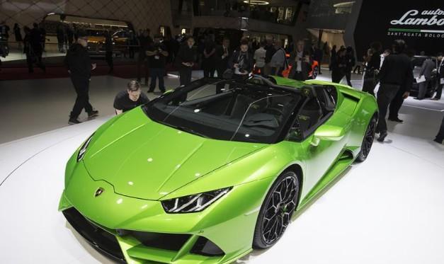 3月5日,在瑞士日内瓦国际车展媒体日预展上,人们观看兰博基尼Huracan EVO Spyder跑车。 第89届日内瓦国际车展当天举行媒体日预展。车展将于3月7日正式拉开帷幕,全球约220家汽车及零配件厂商参展。 新华社记者 徐金泉 摄