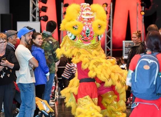 3月9日,在位于新西兰惠灵顿的新西兰国家博物馆,舞狮表演者与现场观众互动。 伴随着喧天的锣鼓声,“中国舞台日”9日在新西兰首都惠灵顿国家博物馆拉开帷幕?!爸泄杼ㄈ铡笔切挛骼脊也┪锕菸?019中新旅游年”举办的活动,新西兰中国文化中心应邀选送了丰富多彩的文艺表演。 新华社记者 郭磊 摄