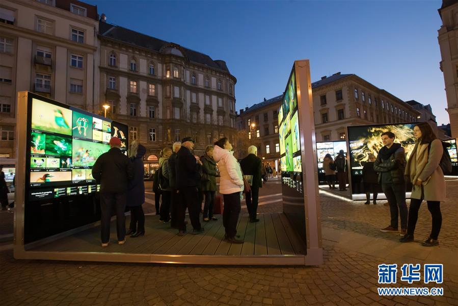 3月20日,在匈牙利布达佩斯,人们在街头观看匈牙利著名摄影师本采·马泰的摄影展。 新华社发(弗尔季·奥蒂洛摄)
