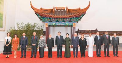 习近平和彭丽媛同外方领导人夫妇及嘉宾合影。