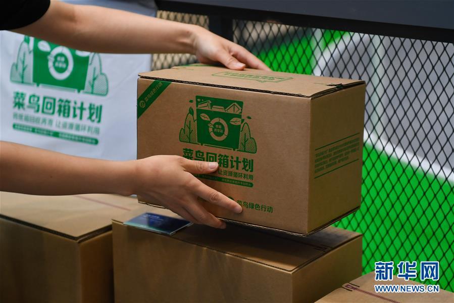 工作人员在菜鸟绿色行动展区展示用于回收快递包装的绿色回收箱 新华社记者黄宗治摄