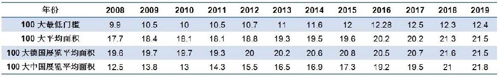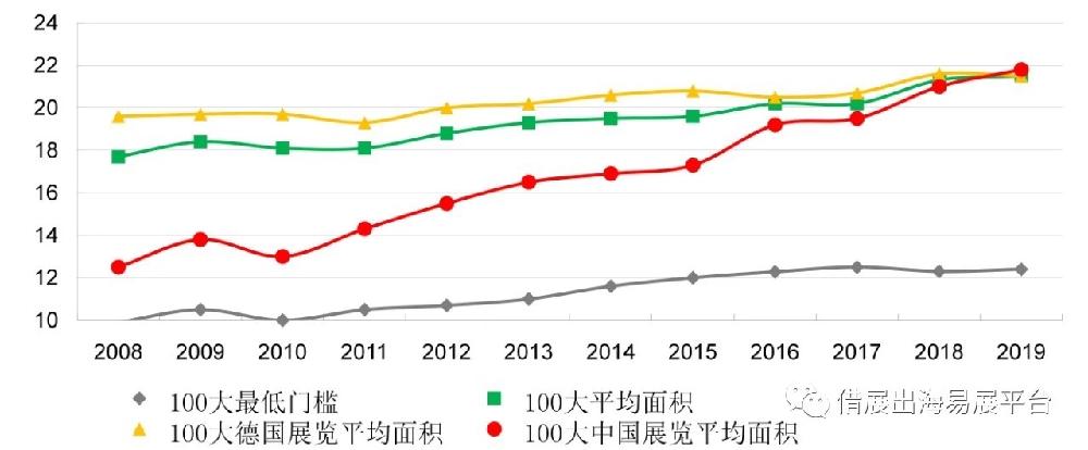 2008年,《进出口经理人》第一次推出商展100大榜单,进入门槛还不足10万平方米,2019年则达到12.4万平方米。12年前,世界商展100大的平均面积是17.7万平方米,2017年和2018年达到20.2和21.3万平方米,2019年进一步增至21.5万平方米。(见表1)