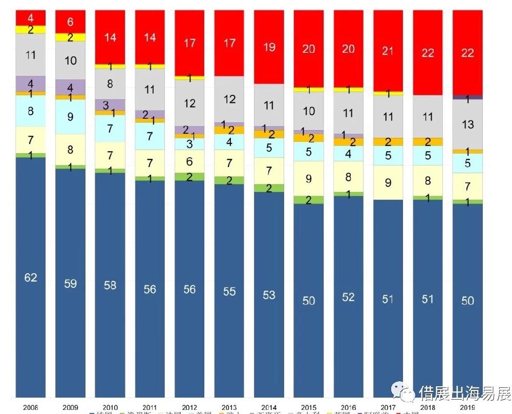 图2 2008-2019年世界商展100大国家分布(单位:个)