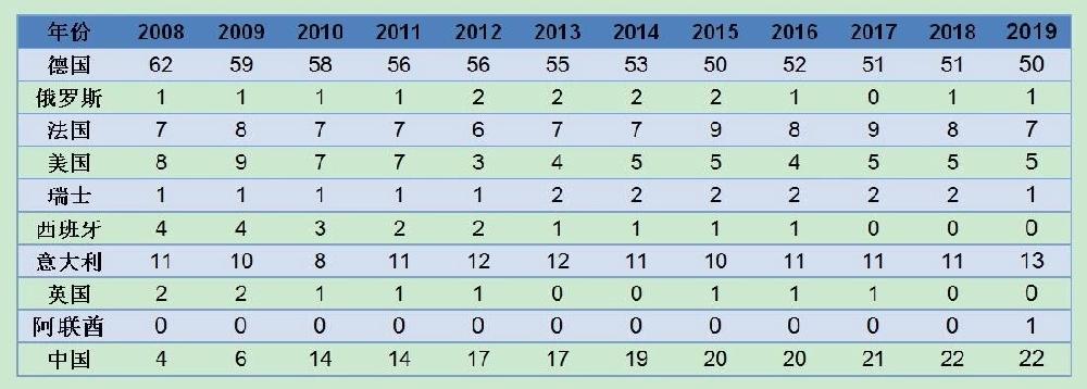 表2 2008-2019年世界商展100大国家分布(单位:个)